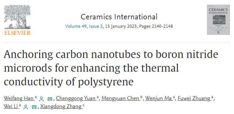 2023年1月15日,bevictor1946韦德官网韩维坊老师在《 Ceramics International 》(中科院1区、TOP期刊)发表了题为 Anchoring carbon nanotubes to boron nitride microrods for enhancing the thermal conductivity of polystyrene 的研究论文,揭示了界面处的导热机理,从微观角度阐释了BN陶瓷和碳纳米管提高高分子材料导热性能的内在原因。