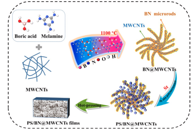 我们采用了一种简单的前体热解策略来制造氮化硼@多壁碳纳米管(BN@MWCNTs)填料,其中均匀分布的MWCNTs被牢固地固定在BN微棒上。受益于其独特的结构,BN@MWCNTs在通过原位聚合设计聚苯乙烯(PS)/BN@MWCNTs复合材料时充当填充物(图1)。