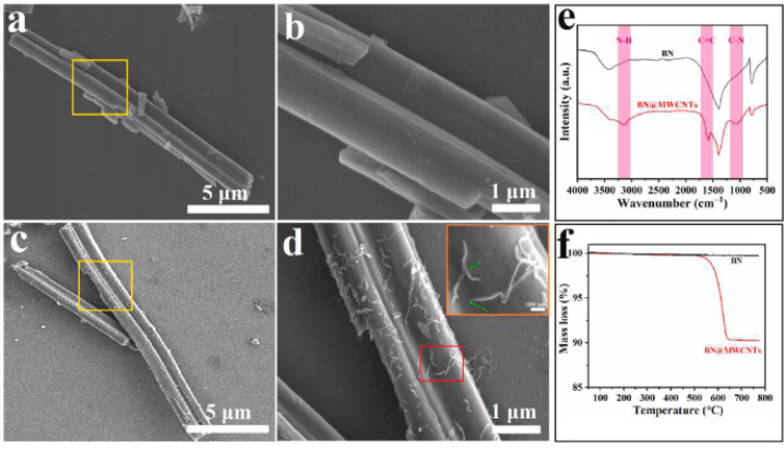 图2. (a, b) BN 和 (c, d) BN@MWCNTs 的 SEM 图像, (e) FTIR 光谱 (f) BN 和 BN@MWCNTs 的 TG 曲线