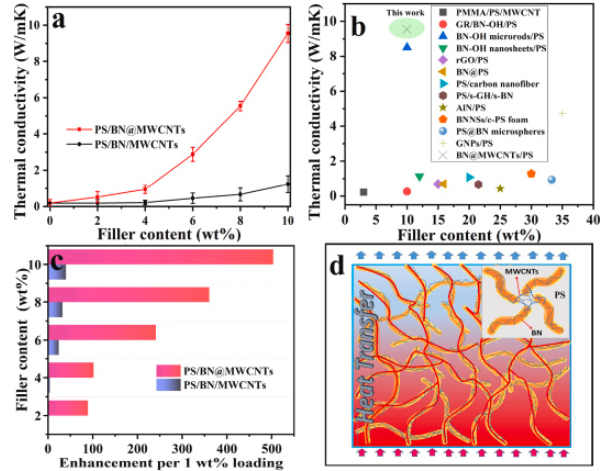 图3. 不同填充物含量的PS/BN/MWCNTs和PS/BN@MWCNTs复合材料的TC。(b) PS/BN@MWCNTs的TC与最近文献中报道的其他PS基复合材料的比较。(c) PS/BN/MWCNTs和PS/BN@MWCNTs复合材料的η。(d) PS/BN@MWCNTs复合材料中的热流传递图。