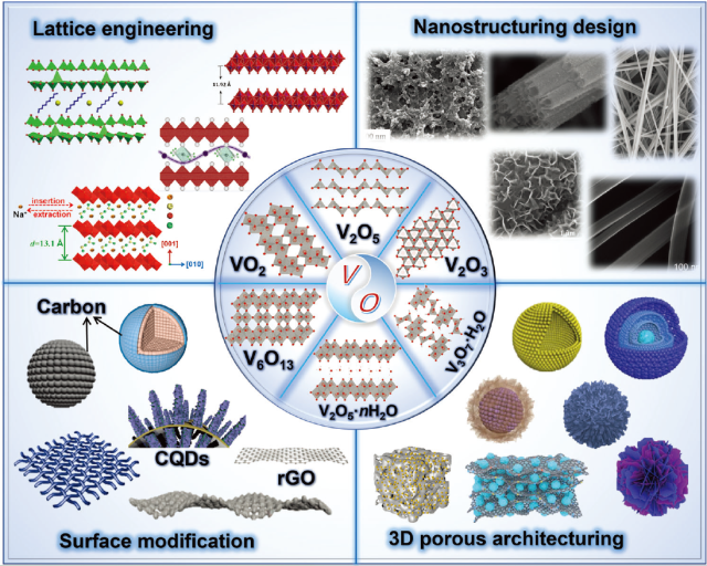 钠离子电池具有具有资源丰富且分布均匀、成本低廉且提取工艺简单、能量密度高且能量转换快等优点,是当前研究的前沿之一。不同的电极材料对电池性能有着不同的影响,因此选择合适的电极材料对于钠离子电池的性能和寿命具有重要作用。目前,在众多钠离子电池电极材料(过渡金属氧化物、聚阴离子型、普鲁士蓝、有机聚合物、碳基材料以及磷化物、硒化物、硫化物等金属化合物)中,钒氧化物材料(V2O5、V2O5· n H2O、VO2、V2O3、V3O7·H2O、V6O13等,如上图所示)因具有多样的晶体结构和丰富的物理化学性质,在钠离子电池中得到了广泛的应用。在这篇综述中,全面而详细地介绍了钒氧化物电极材料用于高性能钠离子电池的最新发展和突破,主要讨论了各种钒氧化物的晶体结构、微观形貌、电化学性能、构效关系以及储钠机理。此外,针对钒氧化物结构稳定性差、电子电导率不高等缺陷,还总结了其进一步的改进策略,比如晶格调控、纳米化设计、表面导电改性和三维多孔结构。如图所示,这些改性策略不仅能够实现钠离子的快速扩散,提升材料的结构稳定性,还可以促进电子的快速传输,大幅度提升材料的电子电导率。最后,探讨了钒氧化物在先进钠离子电池领域存在的挑战和机遇,并展望了提高钒氧化物电极材料综合电化学性能以促进其在钠离子电池应用的商业化前景。