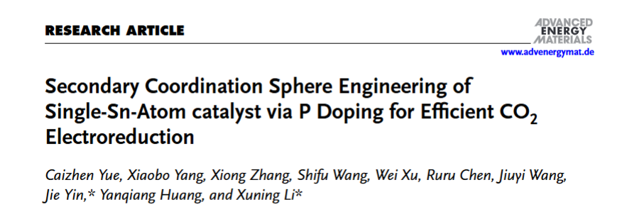 近日,公司新能源材料与器件团队在Advanced Energy Materials(一区TOP期刊,影响因子:27.8)发表了题为 Secondary Coordination Sphere Engineering of Single-Sn-Atom catalyst via P Doping for Efficient CO 2  Electroreduction 的学术研究论文。通过合理设计探索出P掺杂在第二配位壳层的Sn单原子催化剂(P-SnN4-CNT),结合原位表征技术和DFT计算揭示了P在反应过程中的重要作用以及Sn单原子电催化二氧化碳还原到CO的真实活性位点。
