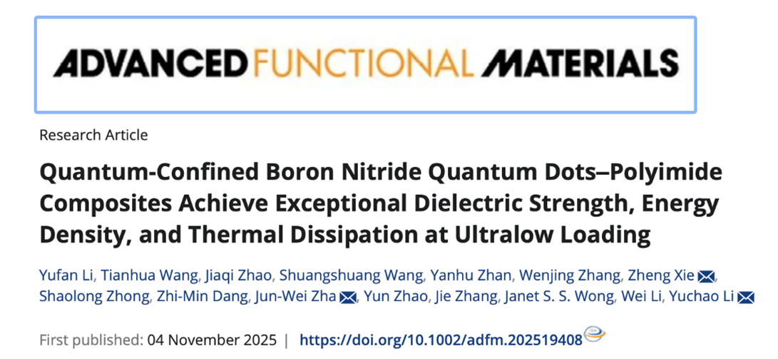 近日,bevictor1946韦德官网李玉超教授团队联合济南大学谢政教授、华北电力大学查俊伟教授,在兼顾耐高温导热储能电介质材料方面取得新的进展。相关成果以“Quantum-confined boron nitride quantum dots-polyimide composites achieve exceptional dielectric strength, energy density, and thermal dissipation at ultralow loading”为题,发表在国际顶级期刊《Advanced Functional Materials》(一区TOP期刊,IF="19.0)上。论文第一作者为硕士研究生李雨凡同学,通讯作者为李玉超教授,bevictor1946韦德官网为第一署名单位。