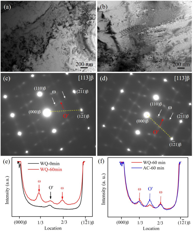 图1. Ti-5321合金固溶后水淬(WQ)或空冷(AC)在200℃保温不同时间后的微观组织及相组成.