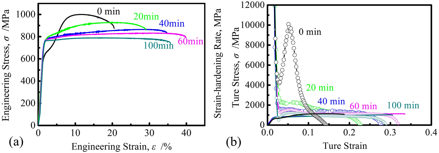 Ti-5321合金固溶后在200℃时效1h后的微观组织与相组成如图1所示,时效过程中ω和O′相持续析出,含量不断上升,与水淬态Ti-5321合金相比,空冷态合金在时效后的组织中O′相含量明显更高。两种亚稳相含量的上升使得合金的屈服强度不断上升,产生了显著析出强化效果,如图2所示。由于空冷态合金在时效后仍然具有更高含量的O′相,其强度可进一步提高。有趣的是由于O′相的形成,ω相本身自带的脆性效果消失,合金在保温时间不超过1h时,塑性没有下降,反而表现出不断上升的趋势,直至保温时间超过1h后ω相致脆效果才逐渐显现。亚稳相含量的上升抑制了变形过程中发生应力诱导相变行为,使得合金的主导变形机制逐渐由应力诱发相变转变为机械孪晶与位错滑移。