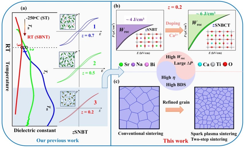近年来,寻找和开发环境友好、符合可持续发展的高性能能量存储器件已经成为当前研究热点之一。其中,陶瓷电介质电容器具有功率密度高、充放电速度快、工作温度范围宽、稳定性好等特点,是储能材料的有力候选者。但是与电化学储能器件相比,陶瓷电容器较低的储能密度限制了它们的应用。因此,如何提高电介质储能陶瓷的储能性能是一项重要的任务。