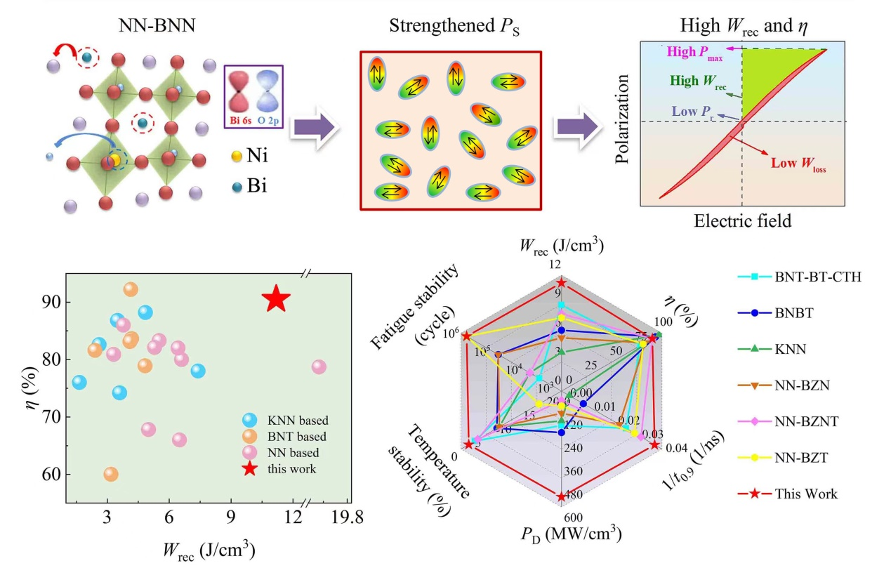介质电容器具有功率密度高、充放电时间短、稳定性好、制造成本低等优点,在集成电路、激光、医疗设备、航空航天和武器等脉冲功率系统中具有巨大的应用潜力,以其优异的储能性能在脉冲电力电子系统和器件中具有显著的应用前景。然而,大的可回收储能密度 W rec通常伴随着低的储能效率 η ,阻碍了它们的实际应用,使得储能密度和效率的协同优化成为一个很大的挑战。