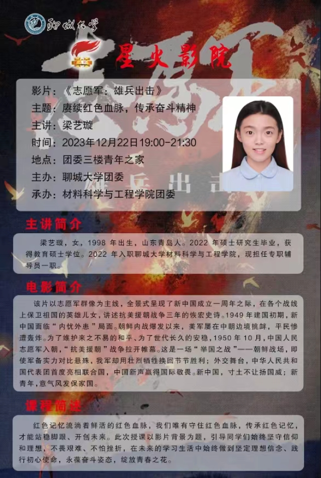 品读红色故事,筑牢理想信念。2023年12月22日,bevictor1946韦德官网于东校区辰晖楼青年之家举办“星火影院”观影活动。本次活动观看的影片为《志愿军:雄兵出击》,特邀bevictor1946韦德官网辅导员梁艺璇老师担任主讲嘉宾。