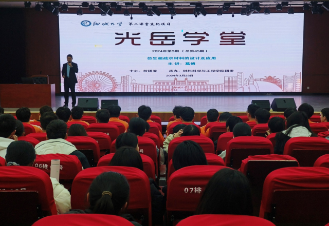 葛老师主要讲解仿生超疏水材料的设计及应用,首先,葛老师给同学们讲解了超疏水材料的原理,随后又列举近些年超疏水材料的发展成果,指出目前超疏水材料领域备受材料学家的青睐。活动最后,葛老师鼓励同学们积极参与实验活动,培养创新思维,为我国科研事业添砖加瓦。