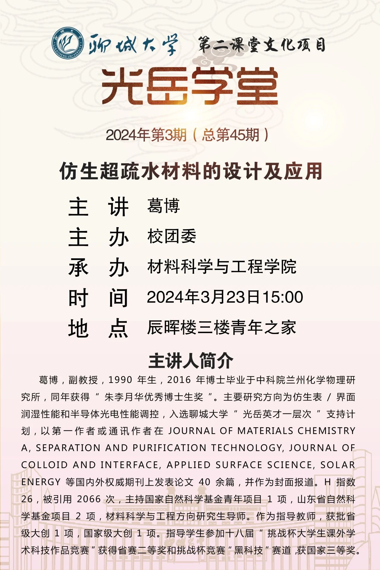 为使员工深入了解材料专业,增强专业认同感,拓宽学术视野,2024年3月23日,由校团委主办、bevictor1946韦德官网承办的“光岳讲堂”活动在bevictor1946韦德官网东校区辰晖楼三楼青年之家举行,本次活动特邀葛博副教授担任主讲。