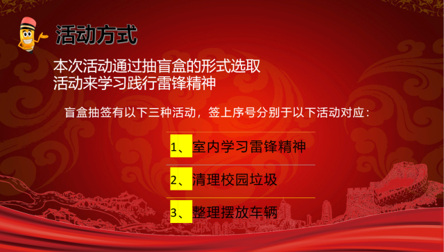 本次活动 活动现场,由负责人简要介绍了本次系列活动的目的与意义,讲述了本次志愿服务系列活动的开展方式,共含“集中学习雷锋精神”、“清理校园垃圾”、“整理摆放车辆”三类,并借助盲盒抽取的形式,现场随机确定活动类型。