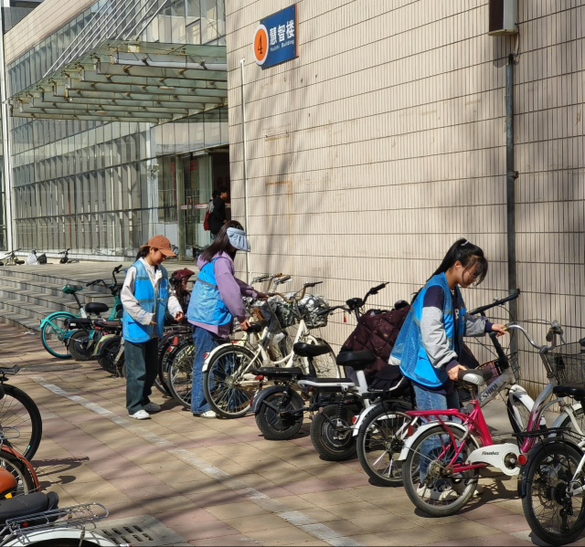 (同学们整理摆放非机动车)
