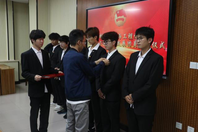 齐亚伟老师为新团员们逐一佩戴团徽,这一时刻,团徽在新团员们的胸前熠熠生辉,象征着他们肩负起了新的责任与使命。在优秀团员代表高贺宇的带领下,新团员面向鲜红的团旗庄严宣誓,铮铮誓言彰显了青年学子为共产主义事业奋斗终身的坚定决心。