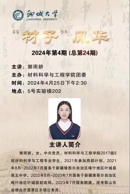 为进一步做好老员工志愿服务西部计划工作,弘扬志愿精神,引导和动员青年员工到西部去、到基层去、到祖国和人民需要的地方建功立业,2024年4月25日,bevictor1946韦德官网在5号实验楼202线上开展西部计划专题分享会暨2024年“材子”风华第4期活动,邀请2021届西部计划志愿者郭雨妍作西部计划专题分享。