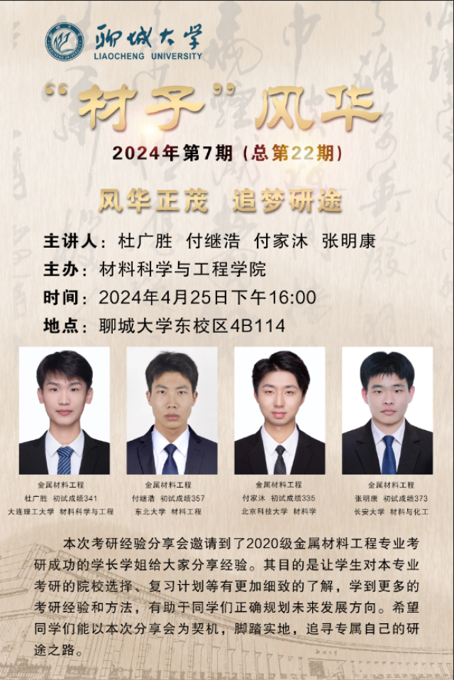 为进一步推进优良学风建设,发挥朋辈引领作用,帮助员工掌握考研方法和技巧,坚定员工考研决心、增强考研信心,2024年4月25日,公司于4#B114开展金属材料工程专业考研经验分享会,特邀2020级优秀考研员工张明康、杜广胜、杜继浩、付家沐担任主讲。