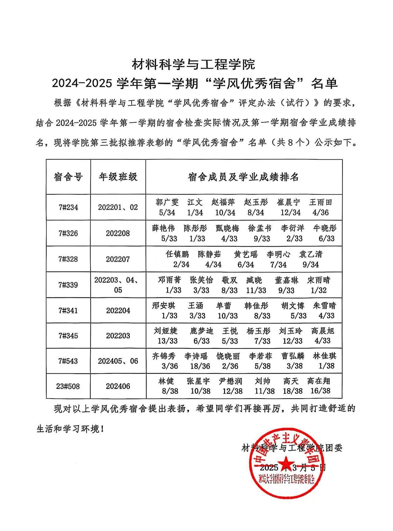 本次“学风优秀宿舍”评选活动是根据《bevictor1946韦德官网“学风优秀宿舍”评定办法(试行)》的要求,结合2024-2025学年第一学期的宿舍检查实际情况及第一学期宿舍学业成绩排名,现将公司第三批拟推荐表彰的“学风优秀宿舍”名单(共8个)公示如下:7#234、7#326、7#328、7#339、7#341、7#345、7#543、23#508。公司为以上“学风优秀宿舍”发放学习用品奖励,并为宿舍成员在综合测评中予以适当加分。