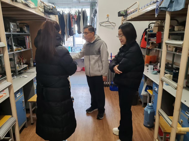 检查组实地走访多间宿舍,重点排查用电安全、消防设施、卫生状况及物品摆放情况,对违规使用大功率电器、私拉电线等安全隐患进行了细致核查。2023级班主任全程协助检查,配合排查线路老化、杂物堆积等问题,并结合各班级住宿实际,向员工讲解冬季防火与安全用电知识,同时认真听取并记录了同学们关于宿舍生活的意见与建议。郑书记在检查中强调,冬季天干物燥,同学们须时刻绷紧安全弦,严格遵守宿舍管理制度,同时注意防寒保暖,保持宿舍通风整洁。