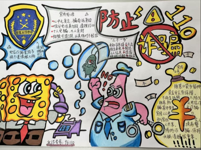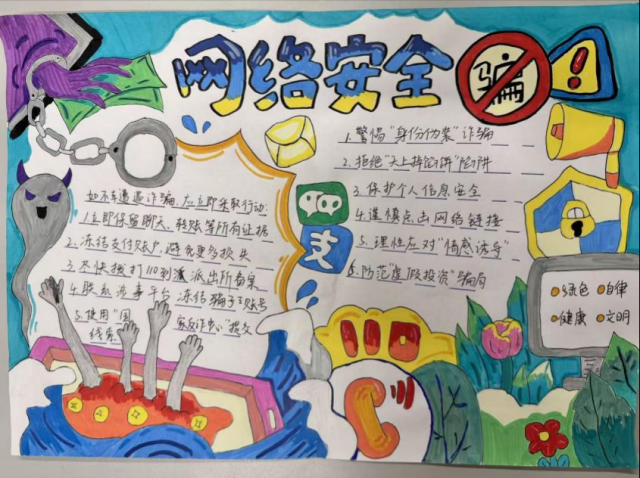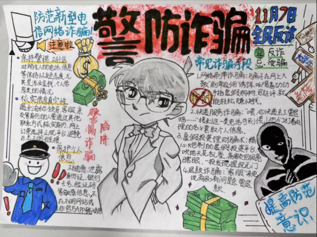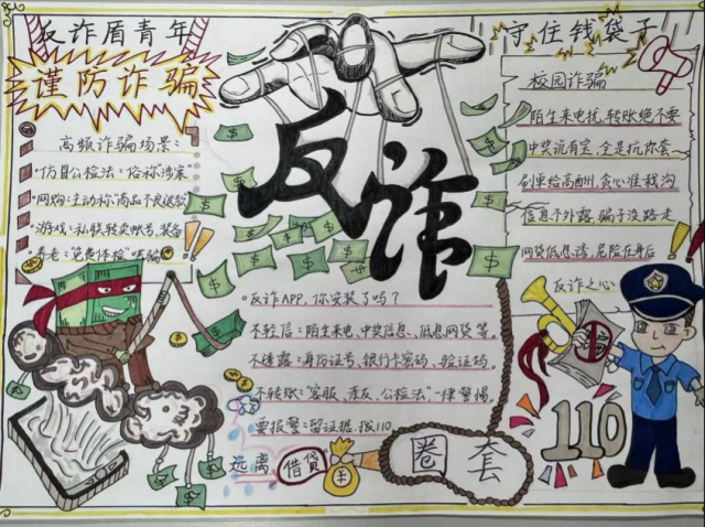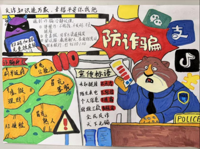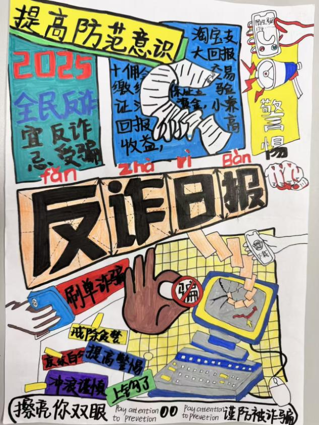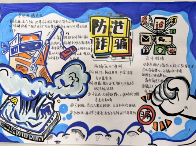 活动中,同学们积极参与,认真搜集反诈案例与防骗知识,将刷单诈骗、游戏充值诈骗、冒充客服诈骗等常见诈骗形式巧妙融入创作。作品形式多样,有的通过色彩对比揭露诈骗手法,有的以连环画形式呈现诈骗过程与防范技巧,内容生动实用,充分展现了同学们对反诈知识的理解与创新表达能力。