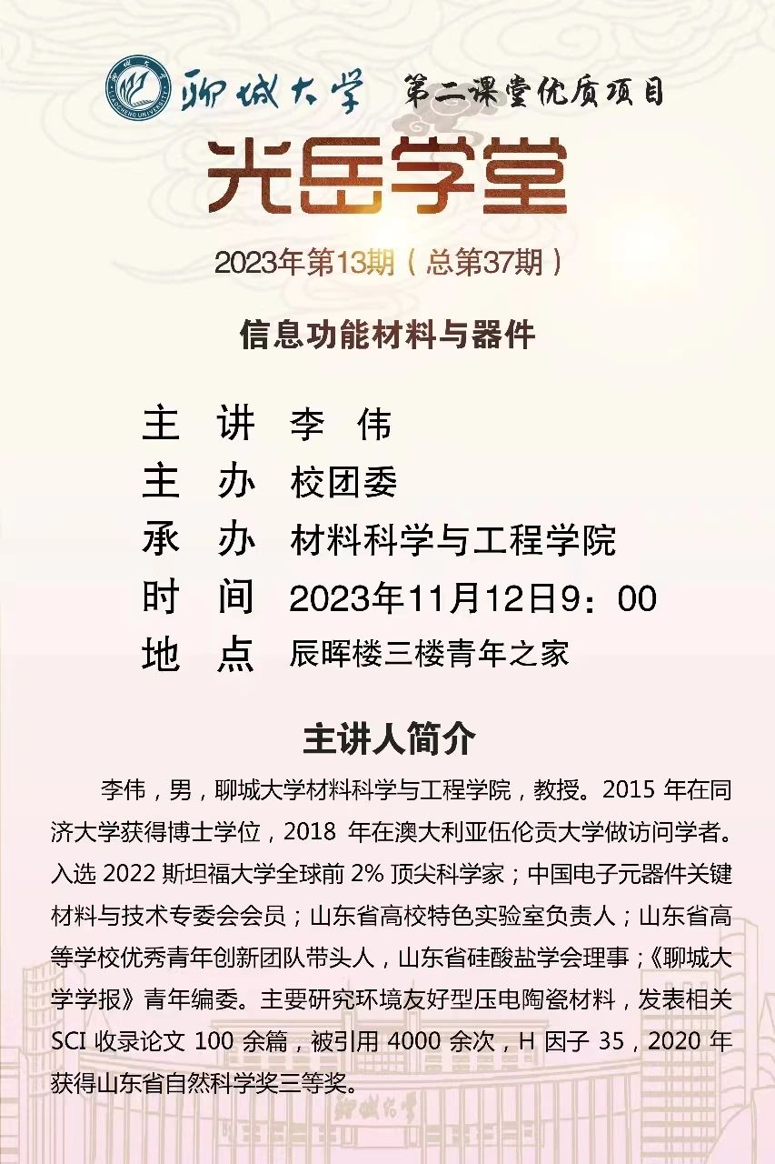 为使同学们了解新型材料发展状况,丰富知识储备,激发同学们探索新材料的热情,2023年11月12日,由校团委主办、bevictor1946韦德官网承办的“光岳学堂”活动在青年之家三楼报告厅举行。本次讲座特邀bevictor1946韦德官网李伟教授担任主讲。