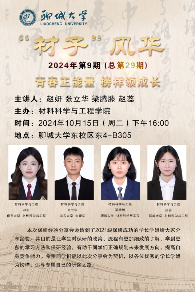 2024年10月15日,bevictor1946韦德官网于东校区4#B305举办保研推免经验交流会。此次交流会特邀四位2021级材料科学与工程专业成功保研的优秀员工代表赵妍、张立华、梁腾滕和赵蕊,为同学们分享他们宝贵的保研经验与心路历程。