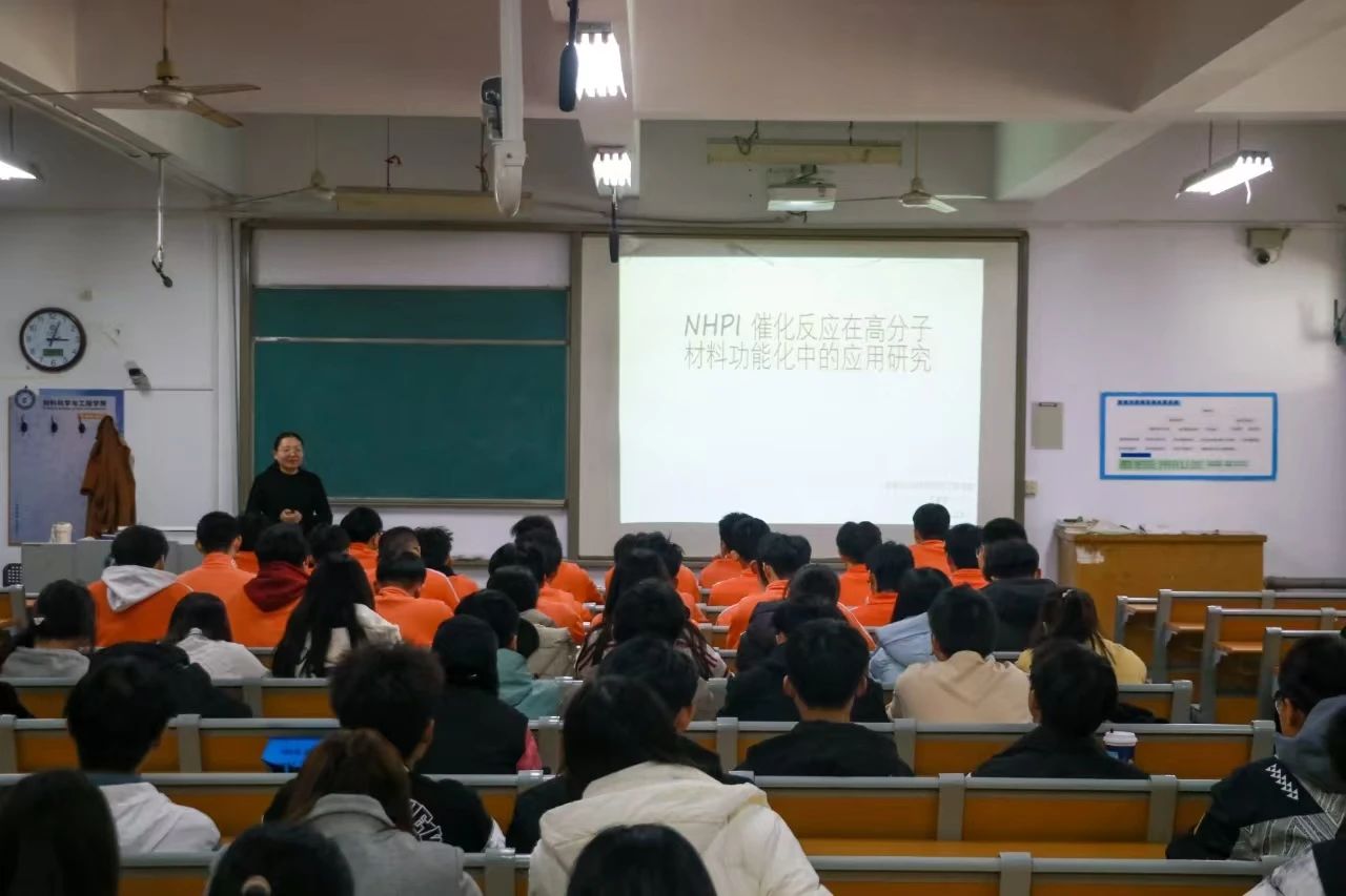 活动伊始,王双双教授以“PEO基聚合物电解质的研究进展”为题,重点向同学们讲解了“NHPI催化反应在高分子材料功能化中的应用研究”,深入剖析了高分子新材料的发展态势。王教授指出,新材料作为高新技术产业的重要支撑,凭借其优异性能和独特功能,已成为当今科技发展的关键驱动力之一,在二十一世纪与信息技术、生物技术共同构成最具发展潜力的核心领域。王教授详细阐述了新材料的分类方式,从结构组成、功能特性到应用领域,多角度展示了新材料的多元性与复杂性,各类别之间相互交织,共同塑造了新材料领域的丰富版图。