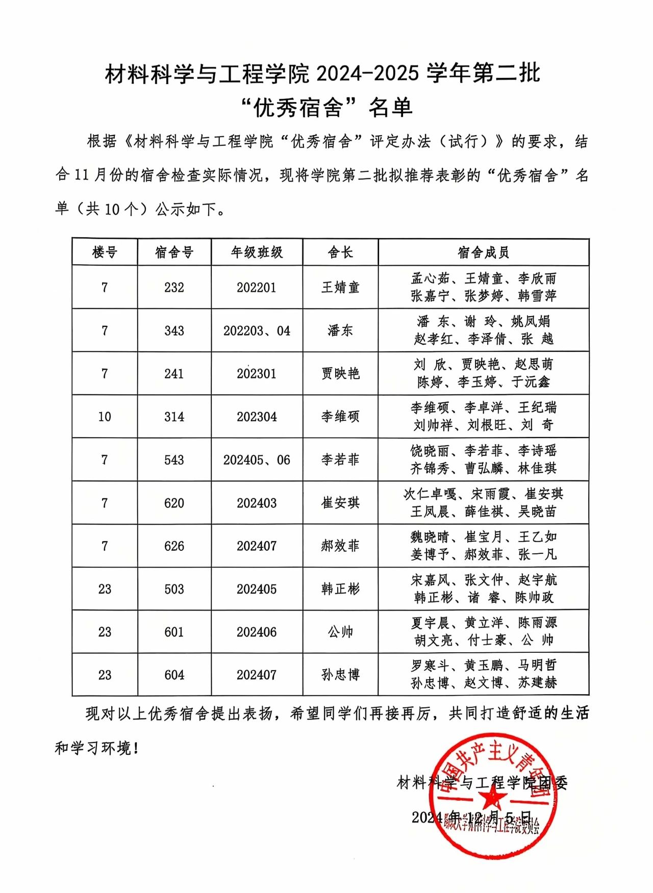 本次“优秀宿舍”评选活动是根据《bevictor1946韦德官网“优秀宿舍”评定办法》的相关要求,结合公司2024年11月份宿舍检查的实际情况,通过每周对公司全体宿舍的安全、卫生等进行严格的检查,并量化打分,确保整个评选过程公平公正。最后评选出本学年第二批“优秀宿舍”共10间,分别是7#232、7#343、7#241、10#314、7#543、7#620、7#626、23#503、23#601、23#604宿舍。公司为以上“优秀宿舍”颁发了流动红旗、发放了宿舍用品奖励,并为宿舍成员在综合测评中予以适当加分。