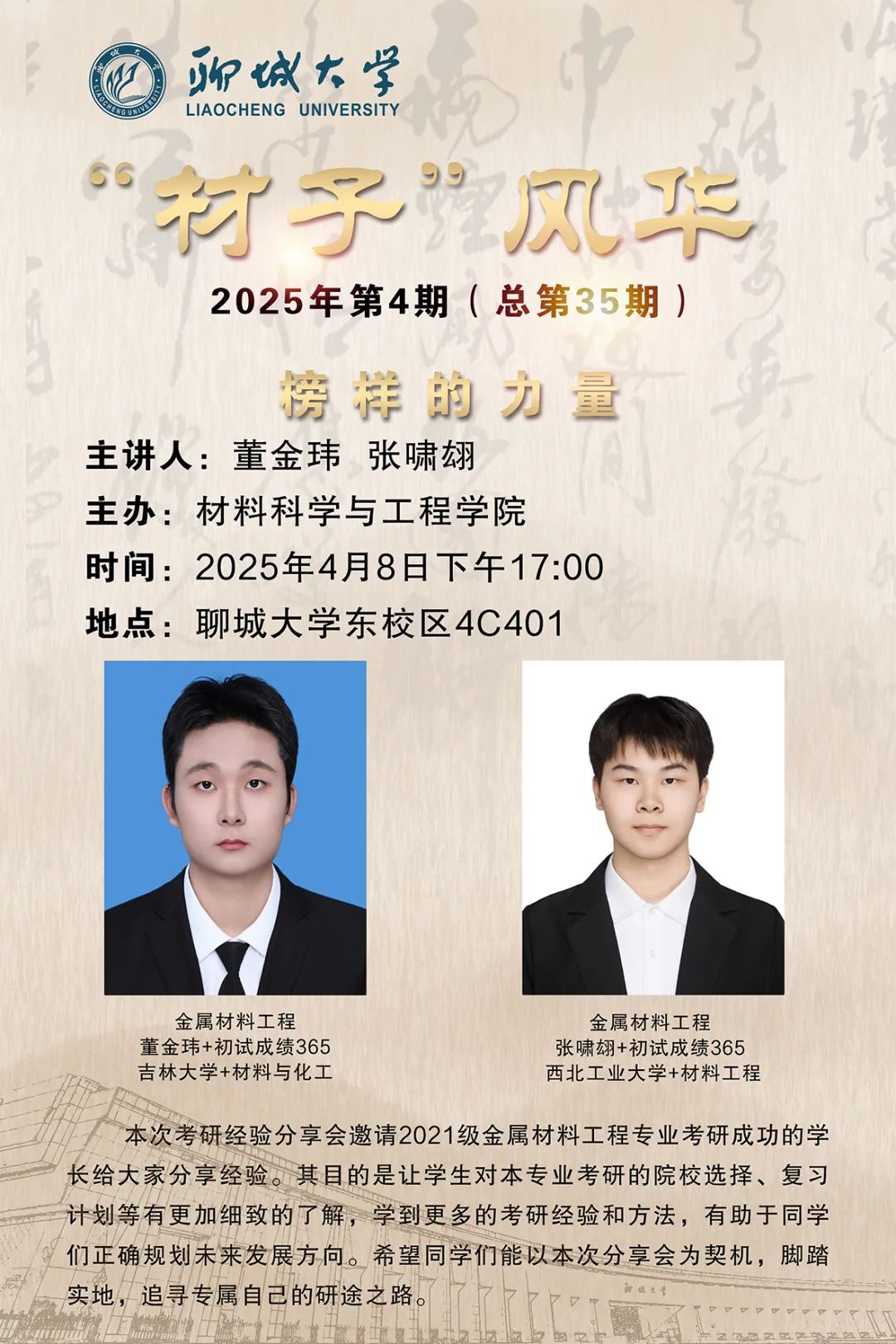 为加强公司学风建设,促进学术交流与人才培养,助力材料学子科学规划考研路径,2025年4月8日,bevictor1946韦德官网于东校区4#C401开展金属材料工程专业考研经验分享交流会。本次交流会特邀2021级金属材料工程专业优秀考研学子董金玮、张啸翃担任主讲嘉宾,2022级金属材料工程专业全体同学参加。