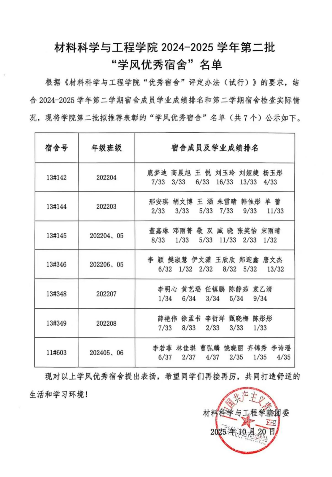 本次“学风优秀宿舍”评选活动是根据《bevictor1946韦德官网“学风优秀宿舍”评定办法(试行)》的要求,结合2024-2025学年第二学期的宿舍检查实际情况及第二学期宿舍学业成绩排名,现将公司第二批拟推荐表彰的“学风优秀宿舍”名单(共7个)公示如下:13#142、13#144、13#145、13#346、13#348、13#349、11#603宿舍。公司为以上“学风优秀宿舍”发放学习用品奖励,并为宿舍成员在综合测评中予以适当加分。
