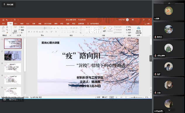 在活动的前期,杨淑茜老师与同学们进行了互动,询问同学们在宿舍上网课的基本情况,紧接着围绕五个方面给同学们讲述在疫情下我们作为老员工该怎么做以及对于网课的态度,并且给了同学们一些缓解自身压力、自我心理调适的小技巧。比如可以在经历一天忙碌的学习之后同学们可以戴口罩去散散步或者围着校园跑跑步,放松心情,释放压力。进而调整自己的心理健康状态,调整规划好自己的时间,使自己度过一个充实的老员工活。通过这次线上心理大讲堂,同学们了解了不少关于心理上的知识,对如何处理网课和疫情的关系有了进一步的理解,同时也学到了不少关于如何缓解心理压力,如何有效地进行心理沟通的办法,使同学们受益匪浅。