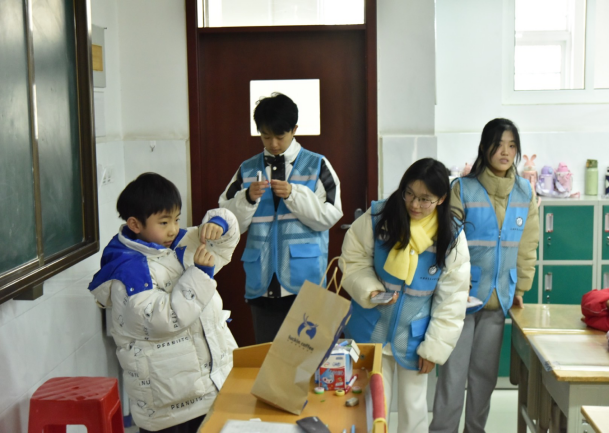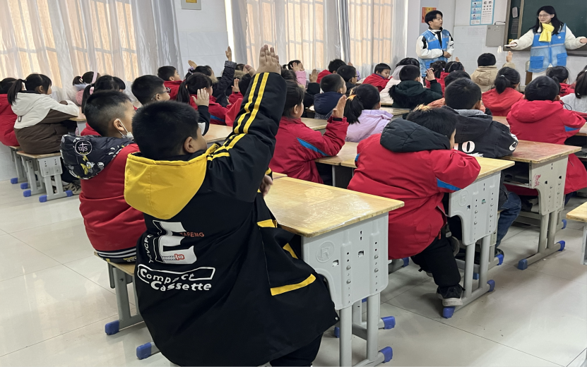 随后,实践小组带领小朋友们开展了两个小游戏,促进小朋友们在娱乐中提高心理健康水平。首先进行的是“你画我猜”,由一个小朋友画画,另一个小朋友根据画来猜成语,小朋友们知识量储备丰富,基本在画没有画完的情况下就能将成语猜出来,并且都非常积极踊跃,争先恐后地要参加这个游戏。第二个游戏是用身体比数字,小朋友先选一个喜欢的数字然后通过动作将数字表示出来让剩下的小朋友们猜。每个小朋友都积极举手想要去讲台上面展示自己,整个班级气氛活跃。实践小组同学们为活动中表现良好的小朋友都准备了一份小礼物。