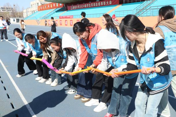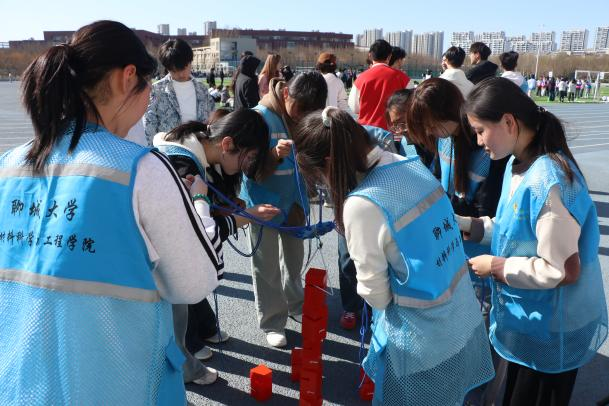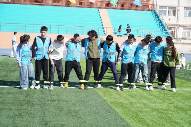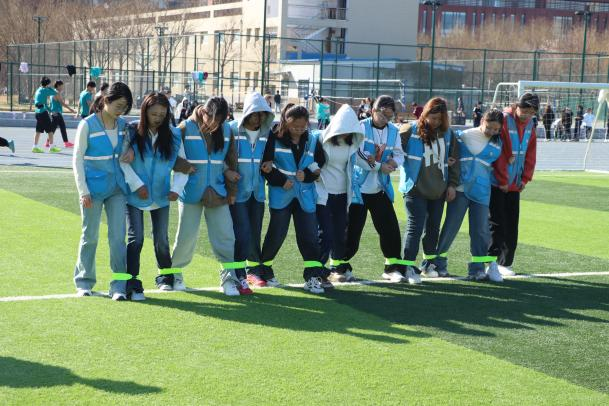 在“鼓动人心”项目中,五名队员需通过精准控制鼓绳张力与节奏,协作完成小球连续颠动。参赛队伍屏息凝神,以默契配合诠释“力出一孔”的团队智慧,每一次小球的腾空跃起,都是对专注力与抗压能力的生动考验。随后的“十人九足”竞速赛将活动推向高潮,十名队员脚踝相连,在“一二一”的口号中齐步疾行。即便偶有队伍因绑绳松动短暂停滞,队员们亦迅速调整状态,以坚韧意志完成30米冲刺,充分彰显“同舟共济”的协作精神。