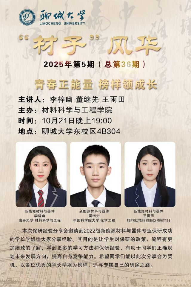 为帮助公司学子把握保研政策,做好学业规划,2025年10月21日,bevictor1946韦德官网于东校区4#B304教室举办“材子”风华 — 新能源材料与器件专业保研经验交流会,邀请2022级优秀保研学子李梓幽、董继先、王雨田担任主讲嘉宾。